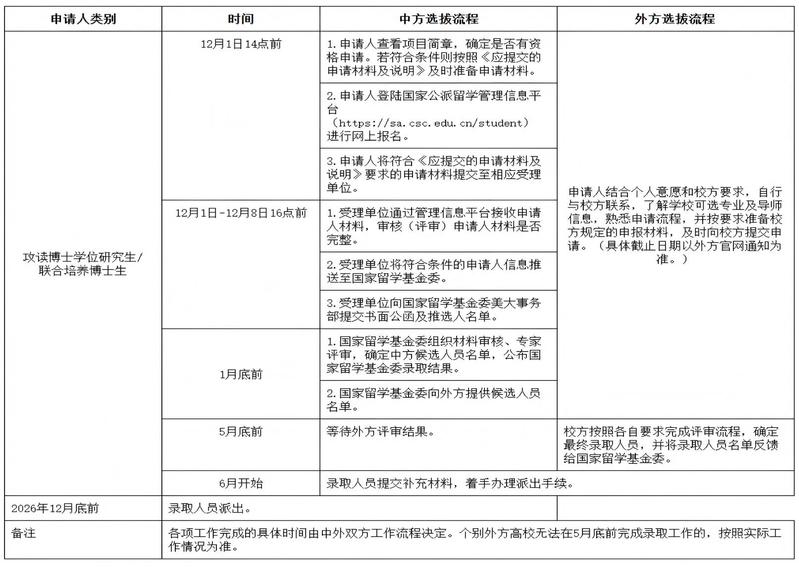 2026年6月开始:录取人员需按照要求提交补充材料,并按照国家留学基金委要求开始办理派出手续。如在此时间前已拿到中外双方录取通知书,可随时提交补充材料,并着手办理派出手续。