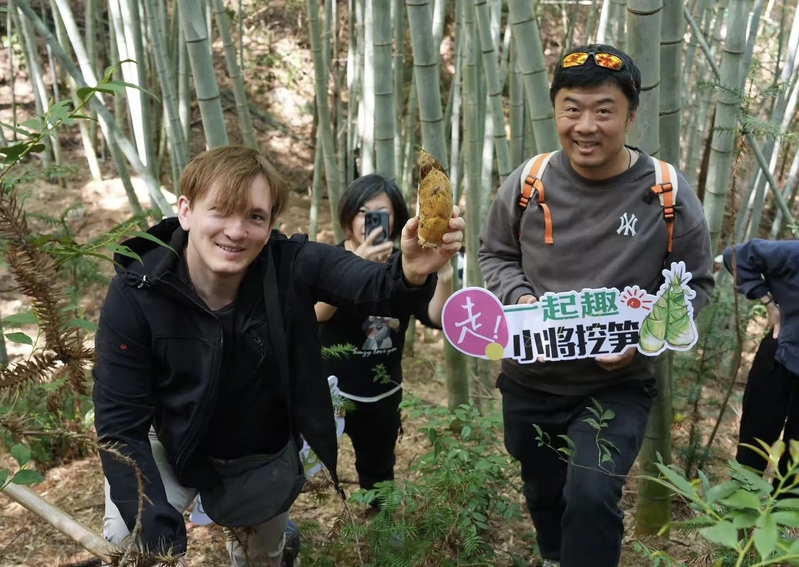 随后,大家开始徒步著名的“十八渡”盐帮古道。这条承载着千年商旅记忆的古道沿溪而建,沿途溪水潺潺、草木葱茏,碇步桥错落排布,一步一渡、一渡一景。行走其间,大家沉醉于每一渡的自然景致,频频驻足拍照,将古道的诗意风光收入镜头。徒步途中,大家兴致勃勃地踏入竹林,亲身体验挖春笋的乐趣。泥土的芬芳与收获的喜悦交织,让国际友人们真切感受到了绍兴乡村的质朴风情与丰盈的自然馈赠。来自美国的留学生俊和拿着自己亲手挖到的笋很兴奋,他觉得挖竹笋的过程非常有趣,也让他更加理解了中国人“不时不食”的饮食智慧。